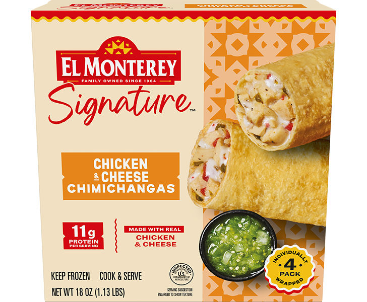 In a world of beef this and steak that, reach for the wrap that says, “You know what? Not today, cow.” Enter the El Monterey® Signature Chicken & Cheese Chimichangas. Packed with premium white meat chicken and shredded cheese, all wrapped in a lightly fried, extra crispy tortilla.