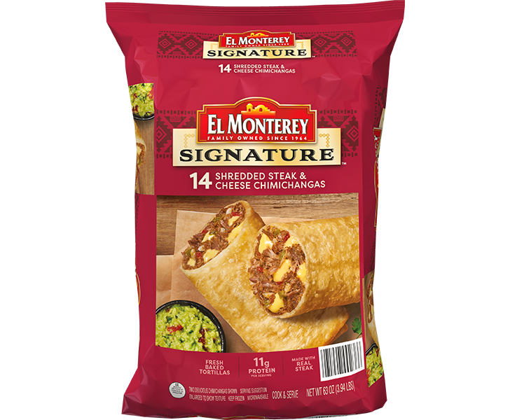 Steak. Cheese. Crispy tortilla. Some wonderful mixture bestowed on us by the flavor gods? Kind of — it’s the El Monterey® Signature Shredded Steak & Cheese Chimichangas. Made with real beef steak, melty cheese, and a blend of Mexican-inspired spices, all wrapped inside a lightly fried tortilla that crisps up beautifully.