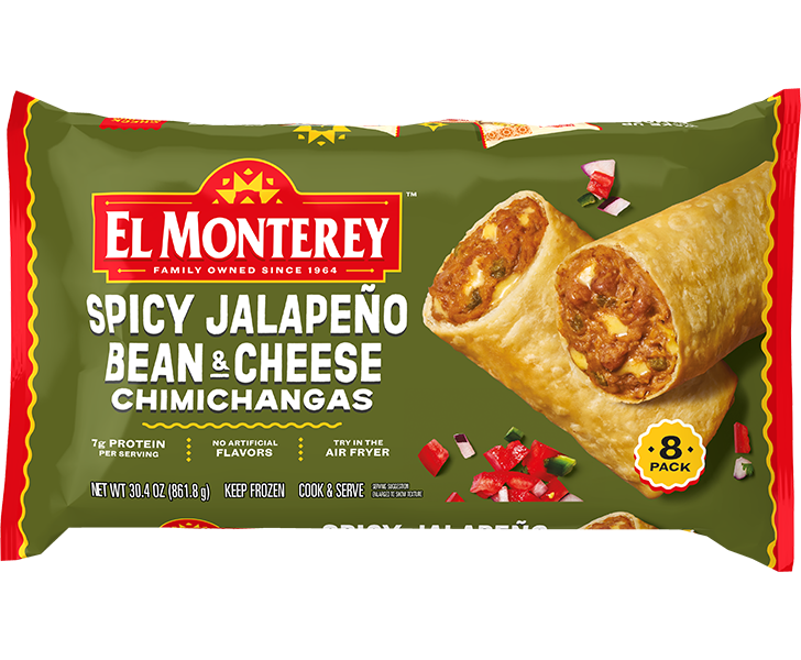 When snack time calls for a little more heat, grab El Monterey® Spicy Jalapeño Bean & Cheese Chimichangas. Inside the crispy tortilla you’ll find seasoned beans, melty cheese, and medium-spicy jalapeños that bring the flavor. Dress them up with salsa, hot sauce, sour cream, or guacamole to turn up the indulgence.