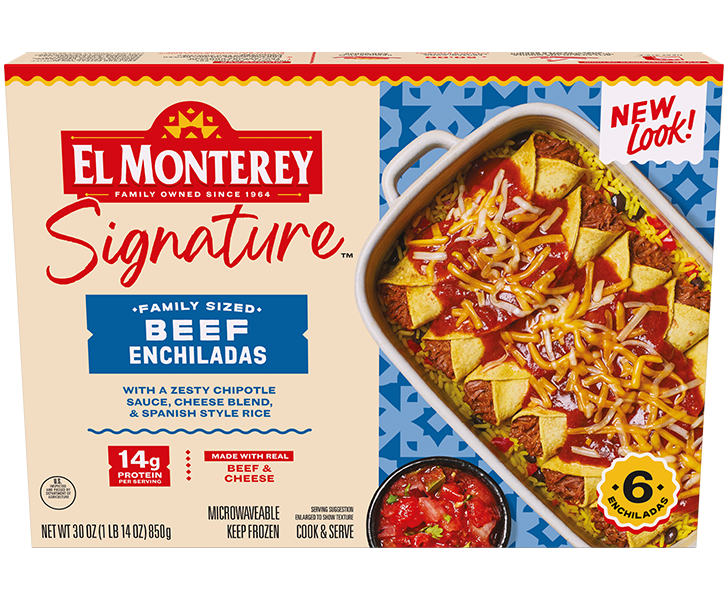 This isn’t a backup plan. It’s the main event. El Monterey® Signature Family Sized Beef Enchiladas bring together tender, seasoned beef, bold chipotle sauce, and melty Monterey Jack and cheddar cheeses, all served over a bed of Spanish-style rice. Six seriously satisfying enchiladas, built to show up at the table and steal the night.