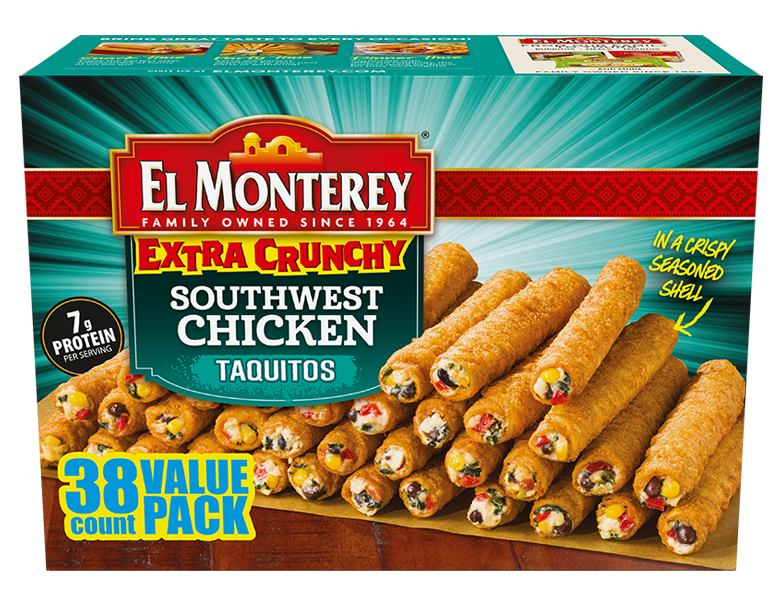 The southwest is best! Take your friends and family on a fun and festive trip with El Monterey® Extra Crunchy Southwest Chicken Taquitos. They’re real chicken, black beans, two cheeses, and authentic Southwest spices wrapped in a crispy seasoned shell.