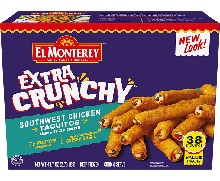 El Monterey® Extra Crunchy™ Southwest Chicken Taquitos bring the crunch front and center. Filled with real chicken, black beans, and two cheeses for a good source of protein. Seasoned with bold Southwest spices, each taquito is wrapped in an extra crispy, fresh baked tortilla that delivers crunch from the first bite to the last.
