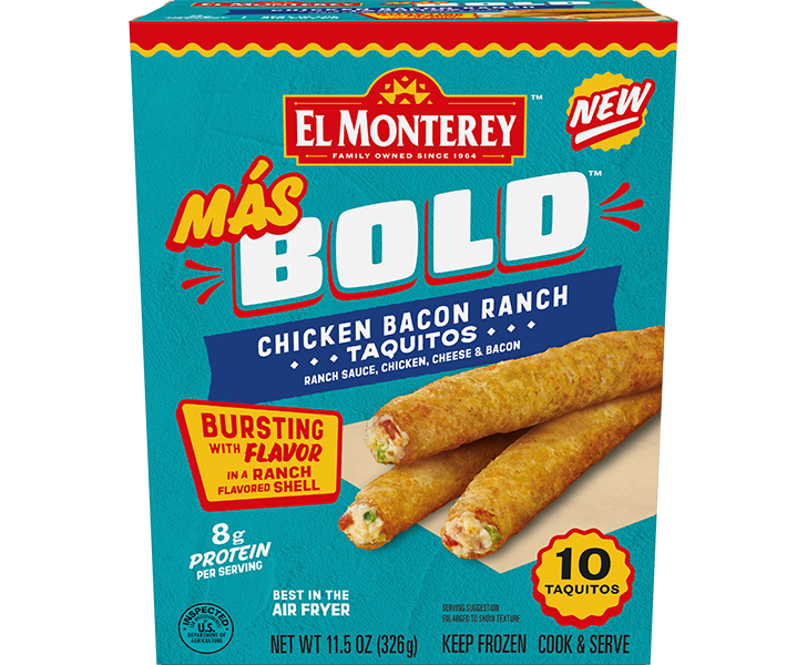 Chicken, bacon, and ranch walk into a tortilla and suddenly — snack time gets interesting. El Monterey® Más Bold™ Chicken Bacon Ranch Taquitos roll up real white meat chicken, smoky bacon, melty cheese, and creamy ranch inside a boldly seasoned tortilla shell.